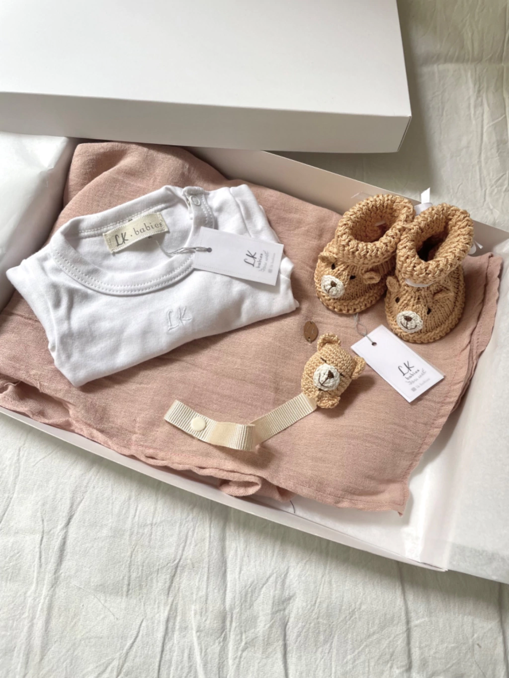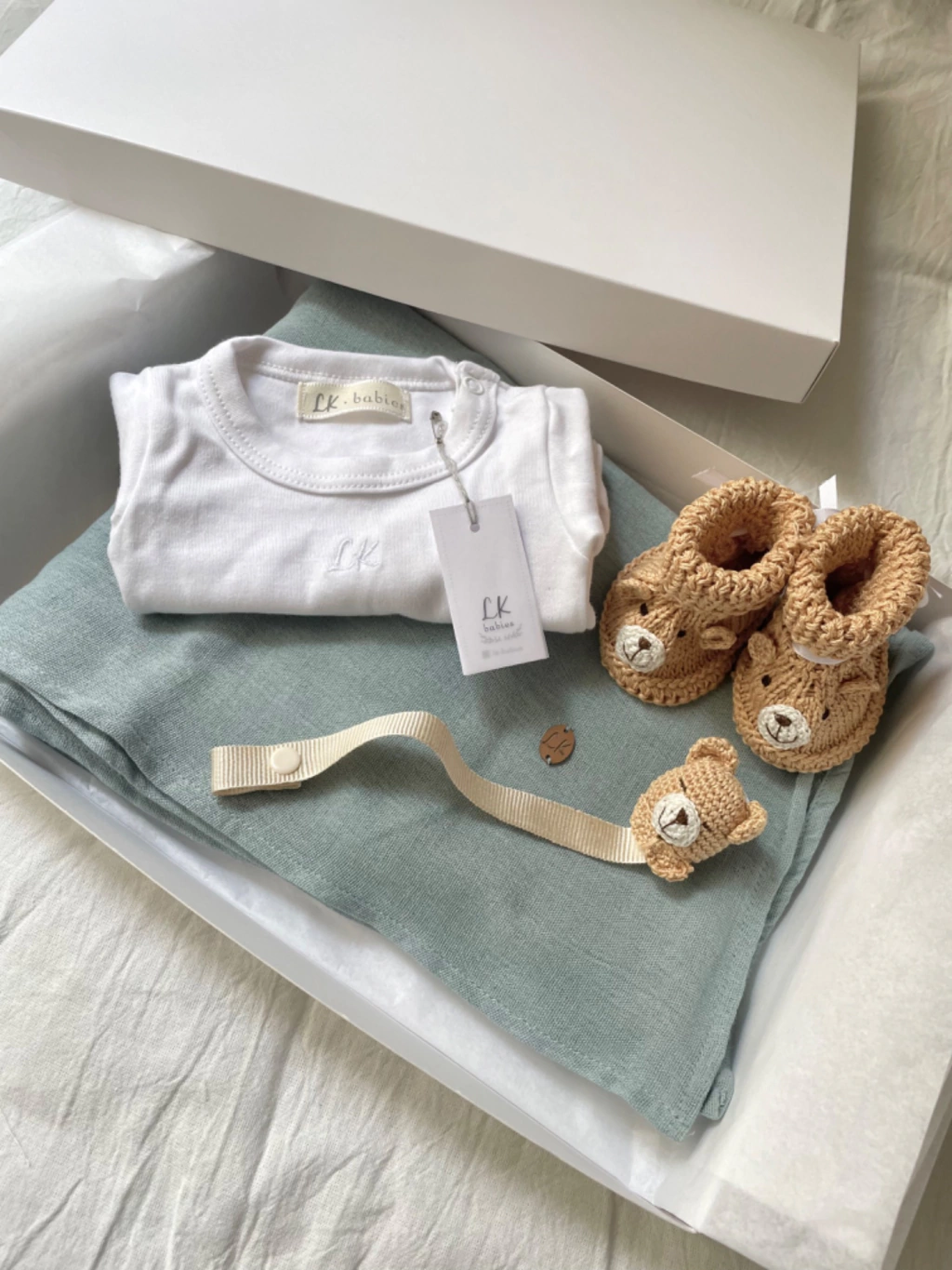 La Baby box incluye un body de algodon pima unisex, una mantita de gasa de algodon, un par de escarpines tejidos y un portachupete tejido